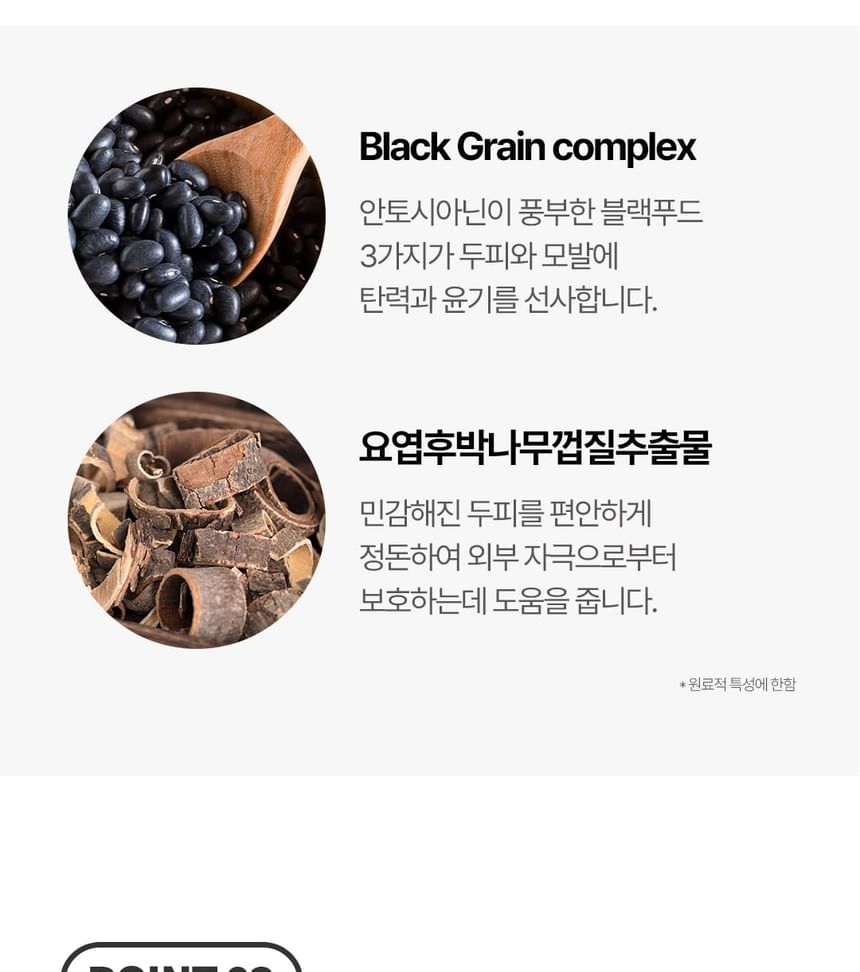 • Black Grain Complex and Magnolia Officinalis Bark Extract restore hair shine and elasticity.
